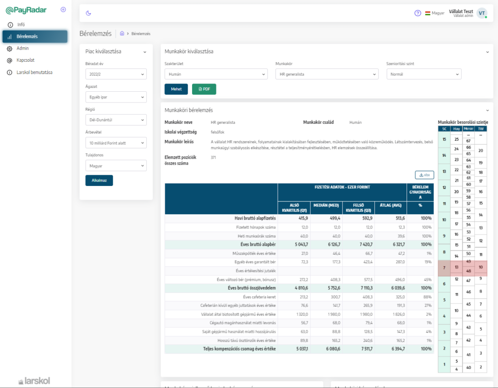 PayRadar munkaköri bérriport alkalmazásunkat olyan szervezetek számára ajánljuk, akiknek a munkaköri besorolási szintek helyett vagy mellett konkrét munkakörökre vonatkozó béradatokra van szükségük. Online alkalmazásunkkal a leggyakoribb 200 munkakör aktuális bérezési és juttatási adatait tudja különféle szempontok szerint lekérdezni.